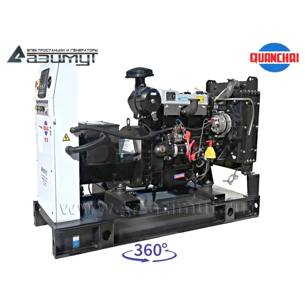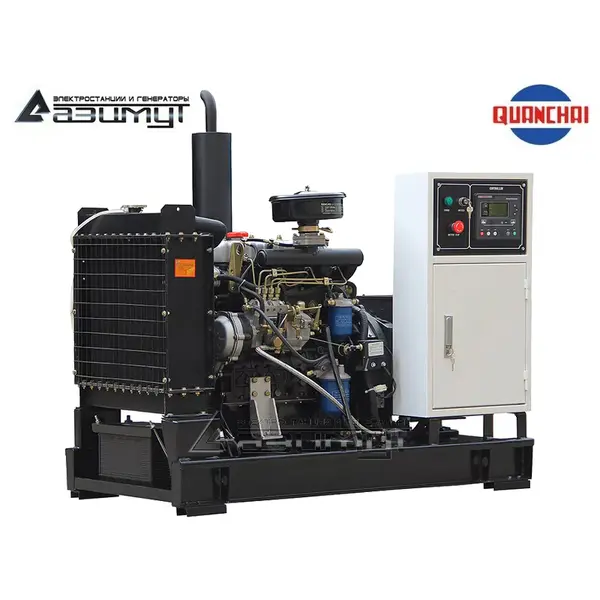 На стальной раме с виброопорами смонтированы: стационарный дизель генератор ДГУ в составе: - первичного четырехцилиндрового дизельного двигателя водяного охлаждения с механической регулировкой частоты вращения Quanchai QC480D, объемом 1,809 л, номинальной мощностью 14 кВт, с промышленным глушителем, стандартным радиаторным блоком охлаждения и подогревателем охлаждающей жидкости,- синхронного бесщеточного трехфазного генератора Azimut Z164C (380 В) номинальной мощностью 10 кВт c автоматической регулировкой напряжения, шкаф управления с автоматическим выключателем, блоком автоматического ввода резерва (АВР) и контроллером HGM6120 с жидкокристаллическим дисплеем, комплект аккумуляторных батарей с сетевым зарядным устройством, стальной топливный бак интегрирован в конструкцию рамы. НАЗНАЧЕНИЕ