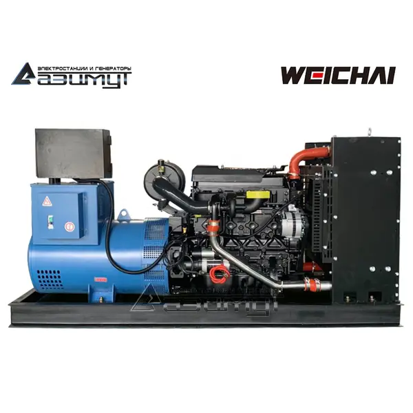 На стальной раме с виброопорами смонтированы: стационарный трехфазный дизель генератор ДГУ в составе: - первичного шестицилиндрового дизельного двигателя водяного охлаждения с механической регулировкой частоты вращения WEICHAI WP6D152E200 с промышленным глушителем и стандартным радиаторным блоком охлаждения, - синхронного бесщеточного генератора AZIMUT Z274FS номинальной мощностью 120 кВт c автоматической регулировкой напряжения, шкаф управления с автоматическим выключателем и контроллером HGM6120 с жидкокристаллическим дисплеем, комплект аккумуляторных батарей, стальной топливный бак интегрирован в конструкцию рамы. НАЗНАЧЕНИЕ