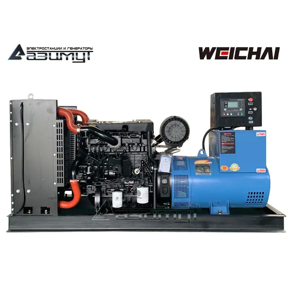 На стальной раме с виброопорами смонтированы: дизель генератор ДГУ в составе: - первичного шестицилиндрового дизельного двигателя водяного охлаждения с механической регулировкой частоты вращения WEICHAI WP6D152E200 с промышленным глушителем и стандартным радиаторным блоком охлаждения,- синхронного бесщеточного генератора AZIMUT Z274FS номинальной мощностью 120 кВт c автоматической регулировкой напряжения, шкаф управления с автоматическим выключателем, блоком автоматического ввода резерва (АВР) и контроллером HGM6120 с жидкокристаллическим дисплеем, комплект аккумуляторных батарей с сетевым зарядным устройством, стальной топливный бак интегрирован в конструкцию рамы. НАЗНАЧЕНИЕ