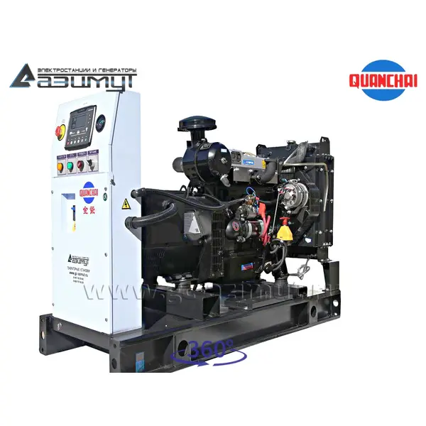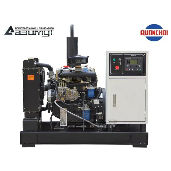 На стальной раме с виброопорами смонтированы: стационаярный дизель генератор ДГУ в составе: - первичного четырехцилиндрового дизельного двигателя водяного охлаждения с механической регулировкой частоты вращения Quanchai N485D, объемом 2,156 литра и номинальной мощностью 15,5 кВт, с промышленным глушителем, стандартным радиаторным блоком охлаждения и подогревателем охлаждающей жидкости,- синхронного бесщеточного генератора Azimut Z164D номинальной мощностью 12 кВт c автоматической регулировкой напряжения, шкаф управления с автоматическим выключателем, блоком автоматического ввода резерва (АВР) и контроллером HGM6120 с жидкокристаллическим дисплеем, комплект аккумуляторных батарей с сетевым зарядным устройством, стальной топливный бак интегрирован в конструкцию рамы. НАЗНАЧЕНИЕ