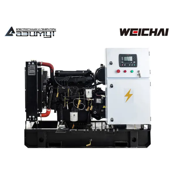 На стальной раме с виброопорами смонтированы: стационарный дизель генератор ДГУ в составе: - первичного четырехцилиндрового дизельного двигателя водяного охлаждения с механической регулировкой частоты вращения WEICHAI WP2.3D25E200 с промышленным глушителем и стандартным радиаторным блоком охлаждения,- синхронного бесщеточного трехфазного генератора 380 В AZIMUT Z184E номинальной мощностью 16 кВт c автоматической регулировкой напряжения, шкаф управления с автоматическим выключателем, блоком автоматического ввода резерва (АВР) и контроллером HGM6120 с жидкокристаллическим дисплеем, комплект аккумуляторных батарей с сетевым зарядным устройством, стальной топливный бак интегрирован в конструкцию рамы. НАЗНАЧЕНИЕ