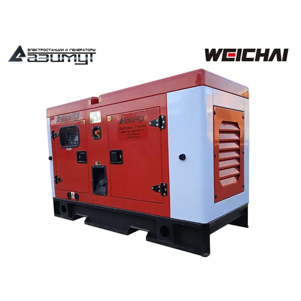 На стальной раме с виброопорами смонтированы: дизель генератор ДГУ 24 кВт в составе: - первичного четырехцилиндрового дизельного двигателя водяного охлаждения с механической регулировкой частоты вращения WEICHAI WP2.3D33E200 с промышленным глушителем и стандартным радиаторным блоком охлаждения,- синхронного бесщеточного трехфазного генератора 380 В AZIMUT Z184G номинальной мощностью 24 кВт c автоматической регулировкой напряжения, шкаф управления с автоматическим выключателем и контроллером HGM6120 с жидкокристаллическим дисплеем, комплект аккумуляторных батарей, стальной топливный бак интегрирован в конструкцию рамы, всепогодный шумозащитный кожух установлен на раму. НАЗНАЧЕНИЕ
