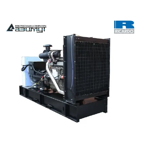 На стальной раме с виброопорами смонтированы: стационарный 3-фазный дизельный генератор в составе: - первичного дизельного двигателя водяного охлаждения с механической регулировкой частоты вращения RICARDO WT13-360DE, номинальной мощностью 327 кВт, с промышленным глушителем и стандартным радиаторным блоком охлаждения,- синхронного бесщеточного 3-фазного генератора на 380 В AZIMUT ZC4FS номинальной мощностью 300 кВт c автоматической регулировкой напряжения, шкаф управления электростанцией (ШУЭ) с блоком АВР, автоматическим выключателем и контроллером HGM6120 с жидкокристаллическим дисплеем, комплект аккумуляторных батарей, рама со стальным топливным баком на 8 часов работы. НАЗНАЧЕНИЕ