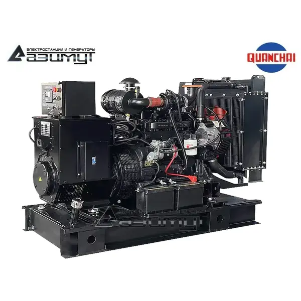 На стальной раме с виброопорами смонтированы: стационарный дизель генератор ДГУ в составе: - первичного четырехцилиндрового дизельного двигателя водяного охлаждения с механической регулировкой частоты вращения Quanchai QC4105D, объемом 4,087 литра и номинальной мощностью 34,5 кВт, с промышленным глушителем и стандартным радиаторным блоком охлаждения и подогревателем охлаждающей жидкости, - синхронного бесщеточного трехфазного генератора Azimut Z184H номинальной мощностью 30 кВт c автоматической регулировкой напряжения, шкаф управления с автоматическим выключателем, блоком автоматического ввода резерва (АВР) и контроллером HGM6120 с жидкокристаллическим дисплеем, комплект аккумуляторных батарей с сетевым зарядным устройством, стальной топливный бак интегрирован в конструкцию рамы. НАЗНАЧЕНИЕ