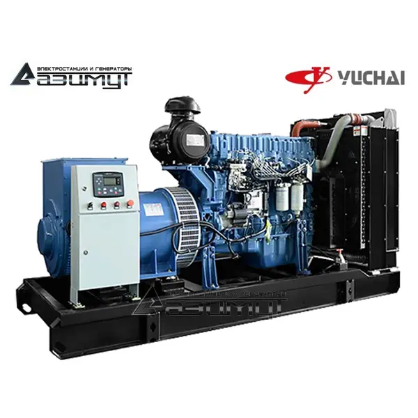 На стальной раме с виброопорами смонтированы: дизель генератор с автозапуском в составе: - первичного шестицилиндрового V-образного дизельного двигателя водяного охлаждения с электронной регулировкой частоты вращения Yuchai YC6K660-D30, объемом 12,94 литра и номинальной мощностью 441 кВт, с промышленным глушителем, стандартным радиаторным блоком охлаждения и подогревателем охлаждающей жидкости,- синхронного бесщеточного генератора Azimut ZC5D номинальной мощностью 400 кВт c автоматической регулировкой напряжения, шкаф управления с автоматическим выключателем, блоком автоматического ввода резерва (АВР) и контроллером HGM6120 с жидкокристаллическим дисплеем, комплект аккумуляторных батарей с сетевым зарядным устройством, стальной топливный бак интегрирован в конструкцию рамы. НАЗНАЧЕНИЕ