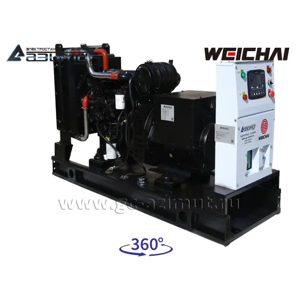 На стальной раме с виброопорами смонтированы: дизель генератор в составе: - первичного четырехцилиндрового дизельного двигателя водяного охлаждения с механической регулировкой частоты вращения WEICHAI WP4.1D66E200 с промышленным глушителем и стандартным радиаторным блоком охлаждения, - синхронного бесщеточного трехфазного генератора 380 В AZIMUT Z224D номинальной мощностью 40 кВт c автоматической регулировкой напряжения, шкаф управления с автоматическим выключателем, блоком автоматического ввода резерва (АВР) и контроллером HGM6120 с жидкокристаллическим дисплеем, комплект аккумуляторных батарей с сетевым зарядным устройством, стальной топливный бак интегрирован в конструкцию рамы. НАЗНАЧЕНИЕ