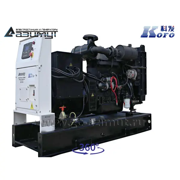 На стальной раме с виброопорами смонтированы: стационарный трехфазный дизель генератор в составе: - первичного четырехцилиндрового дизельного двигателя водяного охлаждения с механической регулировкой частоты вращения Kofo N4105ZLDS, объемом 4,15 литра и номинальной мощностью 60 кВт, с промышленным глушителем и стандартным радиаторным блоком охлаждения,- синхронного бесщеточного генератора AZIMUT Z224E номинальной мощностью 50 кВт c автоматической регулировкой напряжения, шкаф управления с автоматическим выключателем и контроллером HGM6120 с жидкокристаллическим дисплеем, комплект аккумуляторных батарей, стальной топливный бак интегрирован в конструкцию рамы. НАЗНАЧЕНИЕ