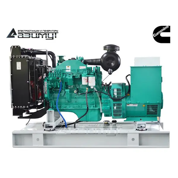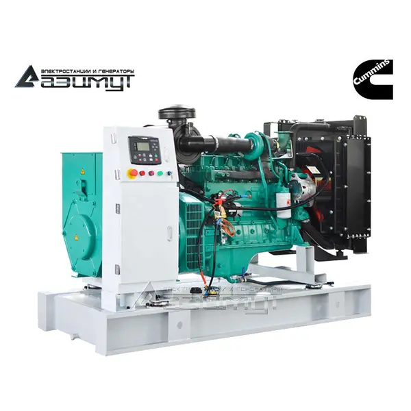 На стальной раме с виброопорами смонтированы: дизель генератор ДГУ в составе: - первичного шестицилиндрового дизельного двигателя водяного охлаждения с электронной регулировкой частоты вращения CUMMINS 6BT5.9-G2, объемом 5,9 литра и номинальной мощностью 86 кВт, с промышленным глушителем и стандартным радиаторным блоком охлаждения, - синхронного бесщеточного генератора AZIMUT Z274C номинальной мощностью 80 кВт c автоматической регулировкой напряжения, шкаф управления с автоматическим выключателем и контроллером HGM6120 с жидкокристаллическим дисплеем, комплект аккумуляторных батарей, стальной топливный бак интегрирован в конструкцию рамы. НАЗНАЧЕНИЕ