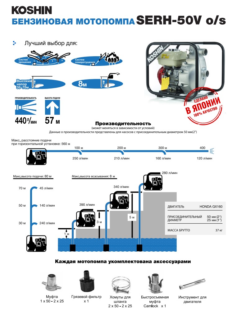 Мотопомпа бензиновая Koshin (Кошин) SERH-50 V является высоконапорной помпой с большой высотой подачи. С помощью бензинового насоса для воды Koshin SERH50V можно эффективно тушить возгорание. Максимальная скорость подачи воды составляет 560 л в час. Для работы пригодна чистая или слабозагрязненная вода с твердыми частицами диаметром до 6 мм.