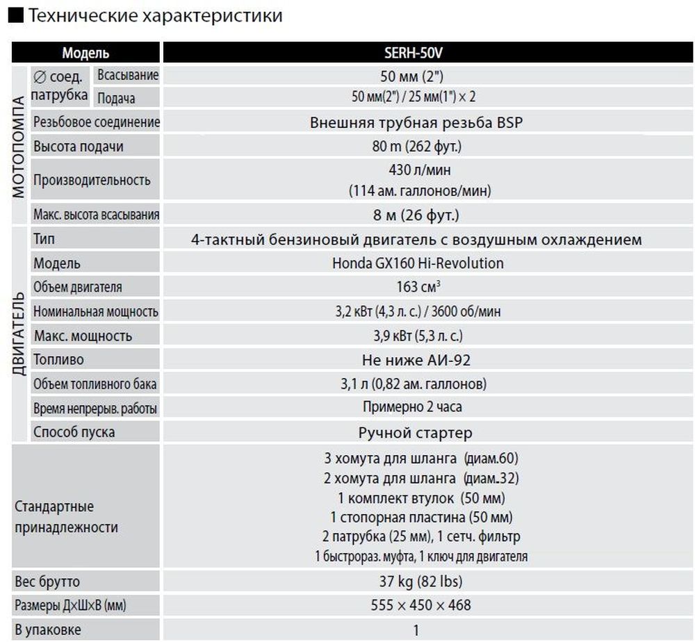 В качестве силового элемента высоконапорная мотопомпа Koshin SERH-50V комплектуется двигателем известного своей надежностью японского бренда Honda с мощностью 4,3 л.с. Время автономной работы устройства на одном полном баке объемом 6 л составляет 4 часа. Бензиновая мотопомпа Koshin SERH50 V изготовлена из качественных высокопрочных материалов и имеет длительный срок службы даже при интенсивной эксплуатации.