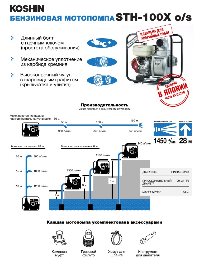 Бензиновая мотопомпа Koshin STH-100X o/s предназначена для работы с большими объемами воды. Способна перекачивать грязную воду с включениями.