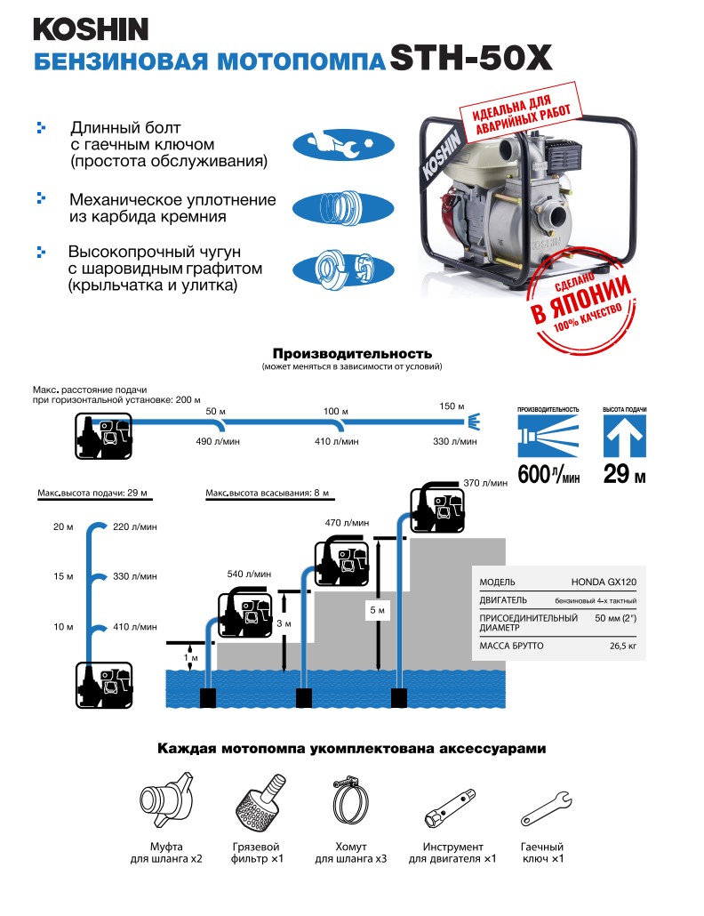 Бензиновая мотопомпа Koshin STH 50X предназначенная для перекачивания чистой и среднезагрязненной воды с твердыми частицами диаметром до 15 мм, илом и камнями.
