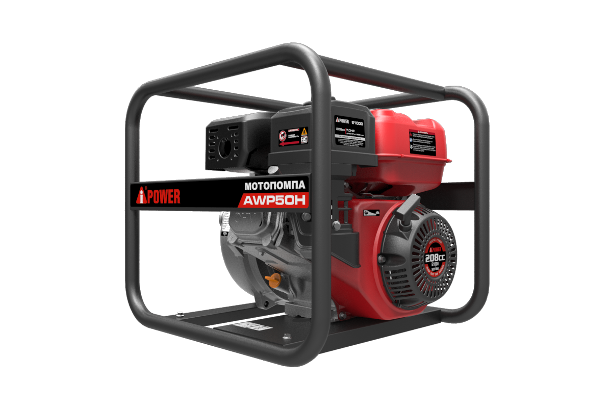 4-х тактный OHV-двигатель с объемом бака 3,6 л расходует 1,4 л за час работы. Воздушное охлаждение не дает бензиновой мотопомпе перегреться даже при абсолютной загрузке. Модель A-iPower AWP50Н имеет массивное прямоугольное основание