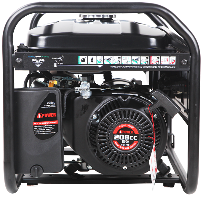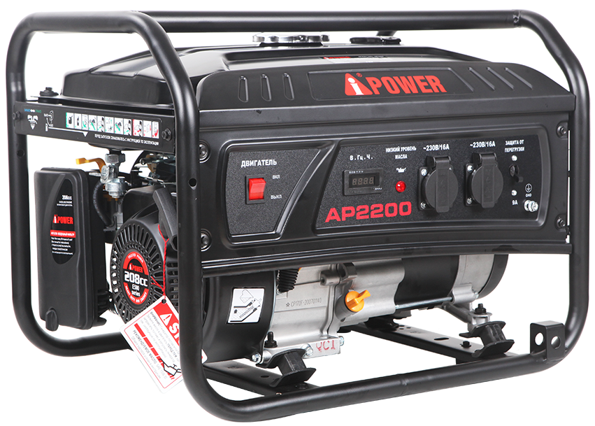A-iPower AP2200 оснащен компактным гильзованным 4-тактным OHV-двигателем объемом 208 куб. см с ручным стартером. На панели управления находятся две стандартные розетки 230В/16А. Розетки закрыты пластиковыми крышками