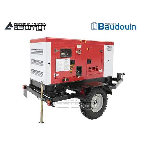 На стальной раме с виброопорами смонтированы: дизель генератор ДГУ в составе: - первичного четырехцилиндрового дизельного двигателя водяного охлаждения с механической регулировкой частоты вращения BAUDOUIN MOTEURS 4M06G44/5e с промышленным глушителем и стандартным радиаторным блоком охлаждения,- синхронного бесщеточного трехфазного генератора 380 В EVOTEC TCU188E номинальной мощностью 30 кВт c автоматической регулировкой напряжения, шкаф управления с автоматическим выключателем и контроллером LOVATO RGK800 с жидкокристаллическим дисплеем, комплект аккумуляторных батарей, стальной топливный бак интегрирован в конструкцию рамы, на раму установлен всепогодный капот, дизель генераторная электростанция установлена на шасси. НАЗНАЧЕНИЕ