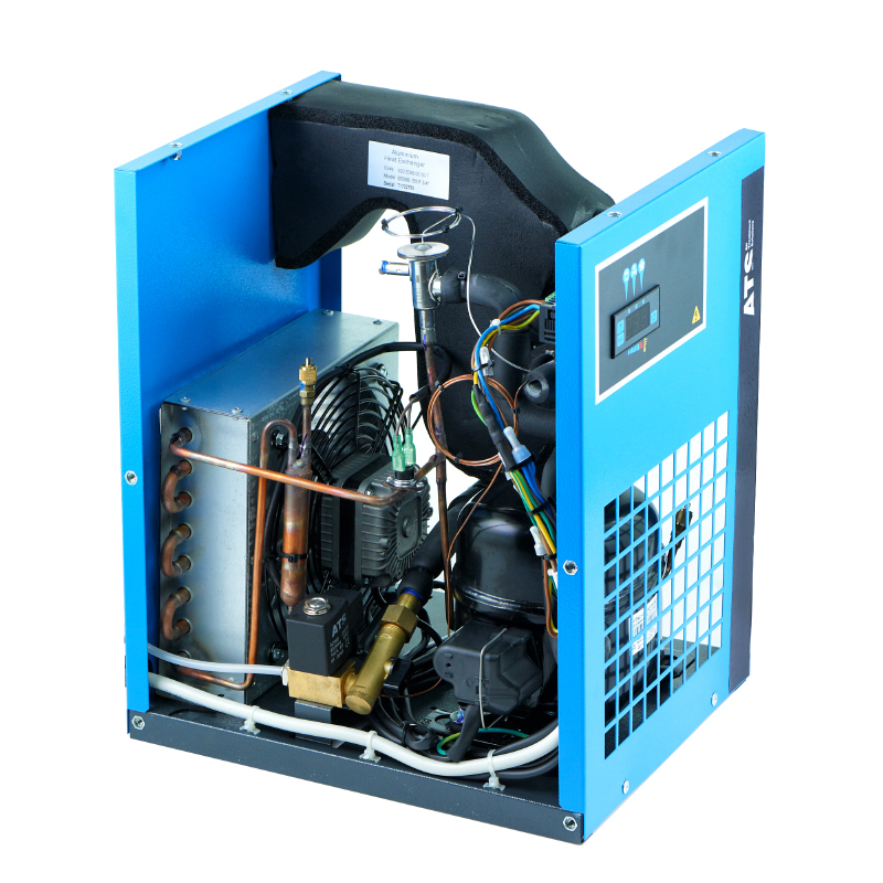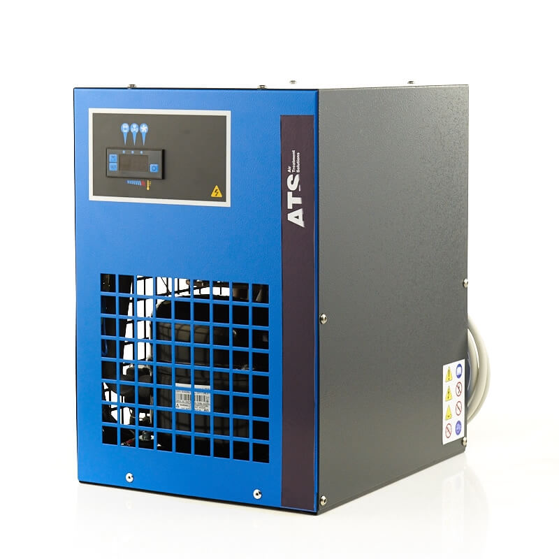 Рефрижераторный осушитель ATS DSI предназначен для удаления влаги из сжатого воздуха путем охлаждения до близких к 0 температур. Сжатый воздух, поступающий с компрессора, охлаждается до температуры точки росы в две стадии. На первой стадии воздушно-воздушный теплообменник охлаждает нагретый воздух при помощи холодного воздуха, поступающего из отделителя конденсата. На второй стадии фреоново - воздушный теплообменник понижает температуру сжатого воздуха до заранее заданной температуры точки росы. На этой второй стадии благодаря пониженной температуре все пары воды конденсируются и впоследствии отделяются от воздуха при помощи высокопроизводительного отделителя влаги. Получаемый конденсат затем сливается автоматическим электронным сливом. На этом этапе холодный сухой воздух поступает обратно в теплообменник первой стадии охлаждения, где снова нагревается входящим горячим воздухом. Данный метод позволяет возвращать тепловую энергию предварительно охлажденному воздуху и исключить появление конденсата н а внешних стенках трубопровода ниже по потоку от осушителя.