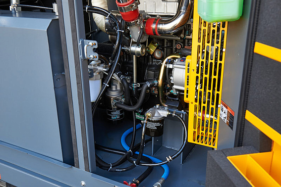 - Топливный бак высокой ёмкости позволяет эксплуатировать компрессор полную рабочую смену при 100 %-ной нагрузке без долива топлива