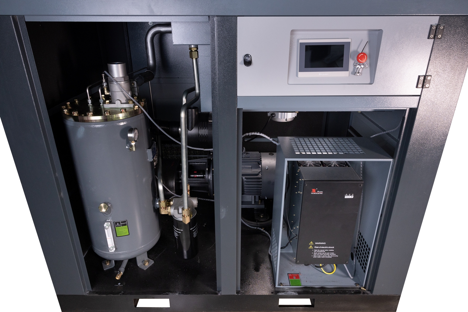 Частотный преобразователь Folinn обеспечивает плавный запуск и остановку компрессора, снижает пусковые токи двигателя и защищает устройство от перегрузок, короткого замыкания или потери фазы.