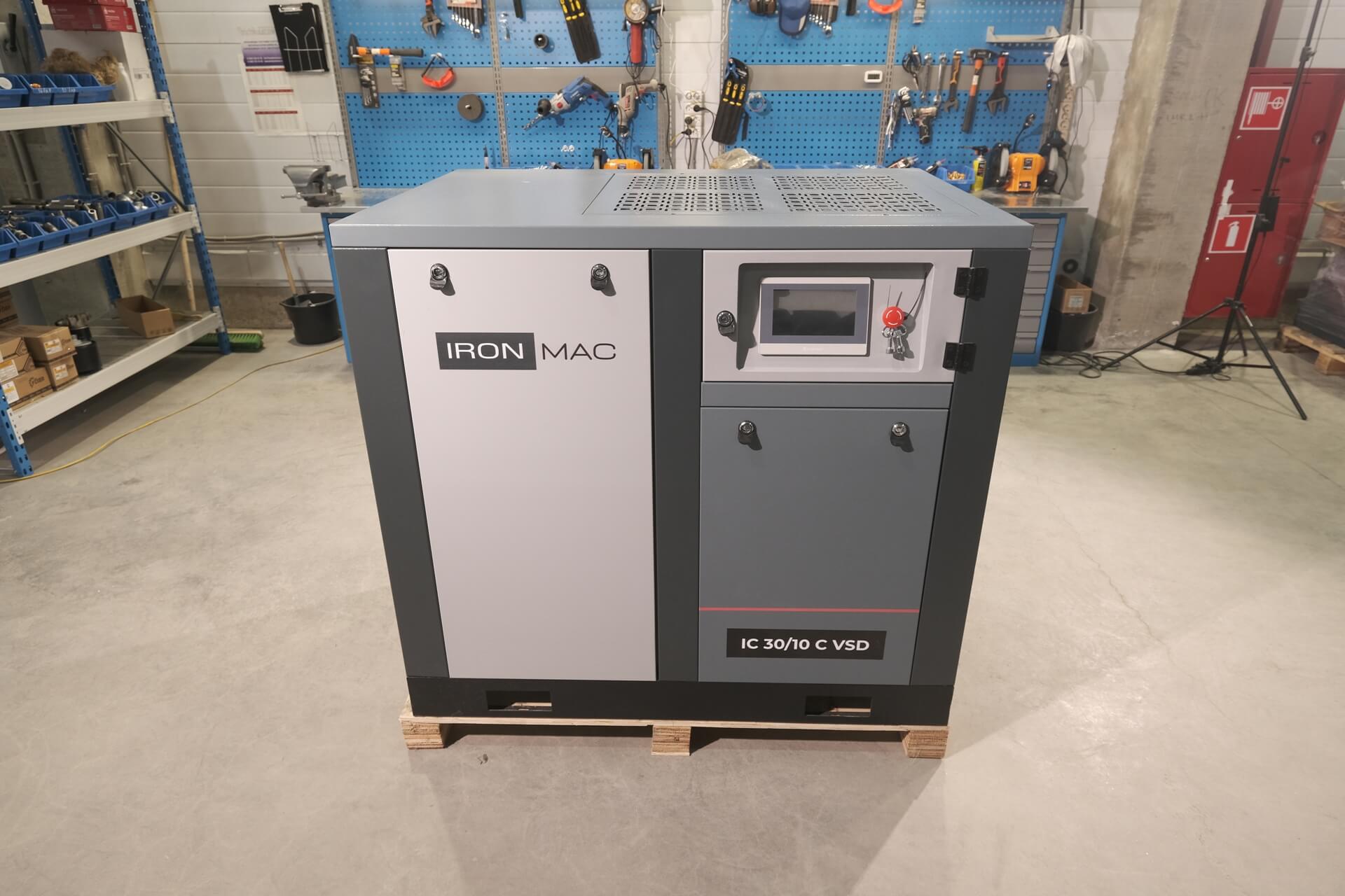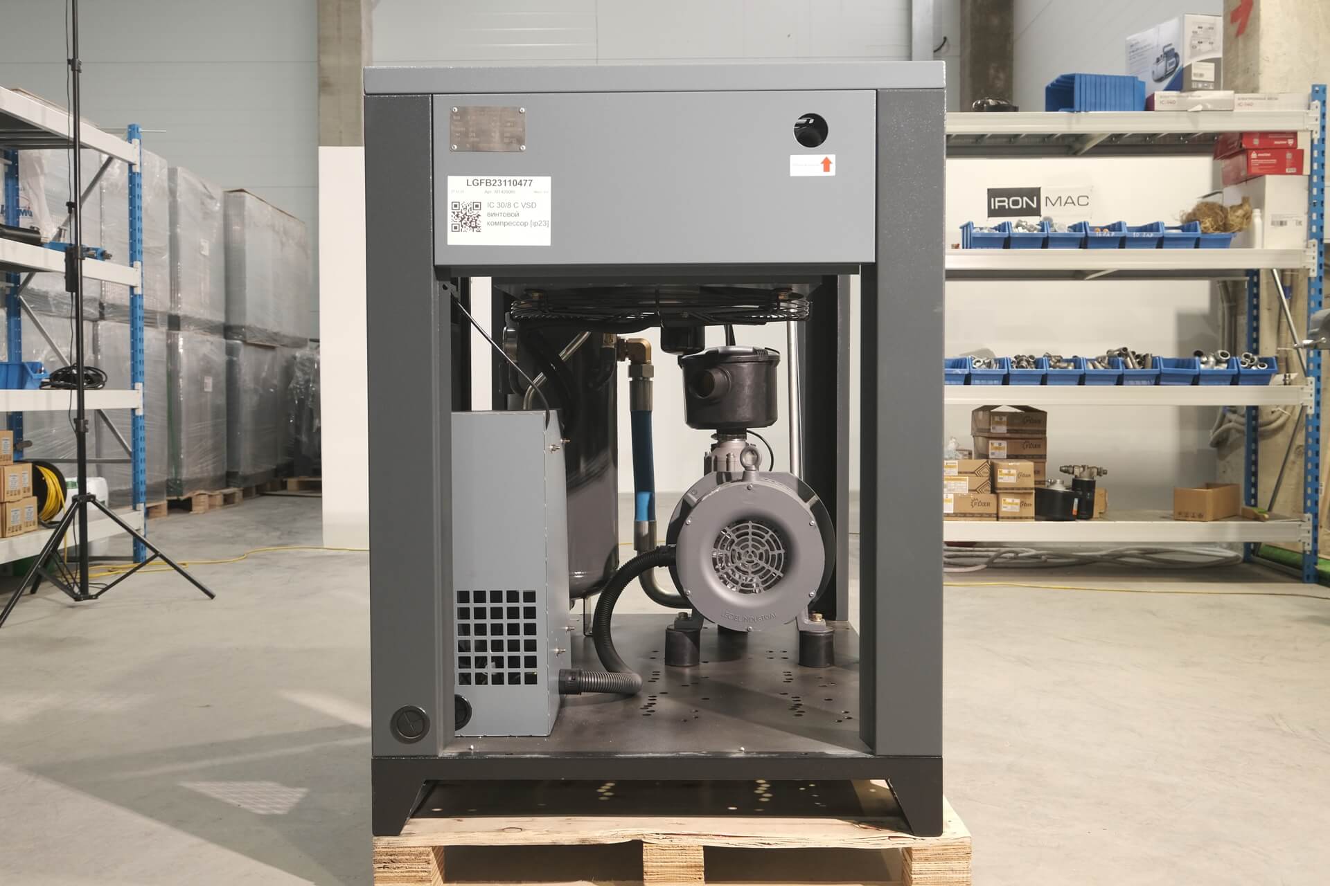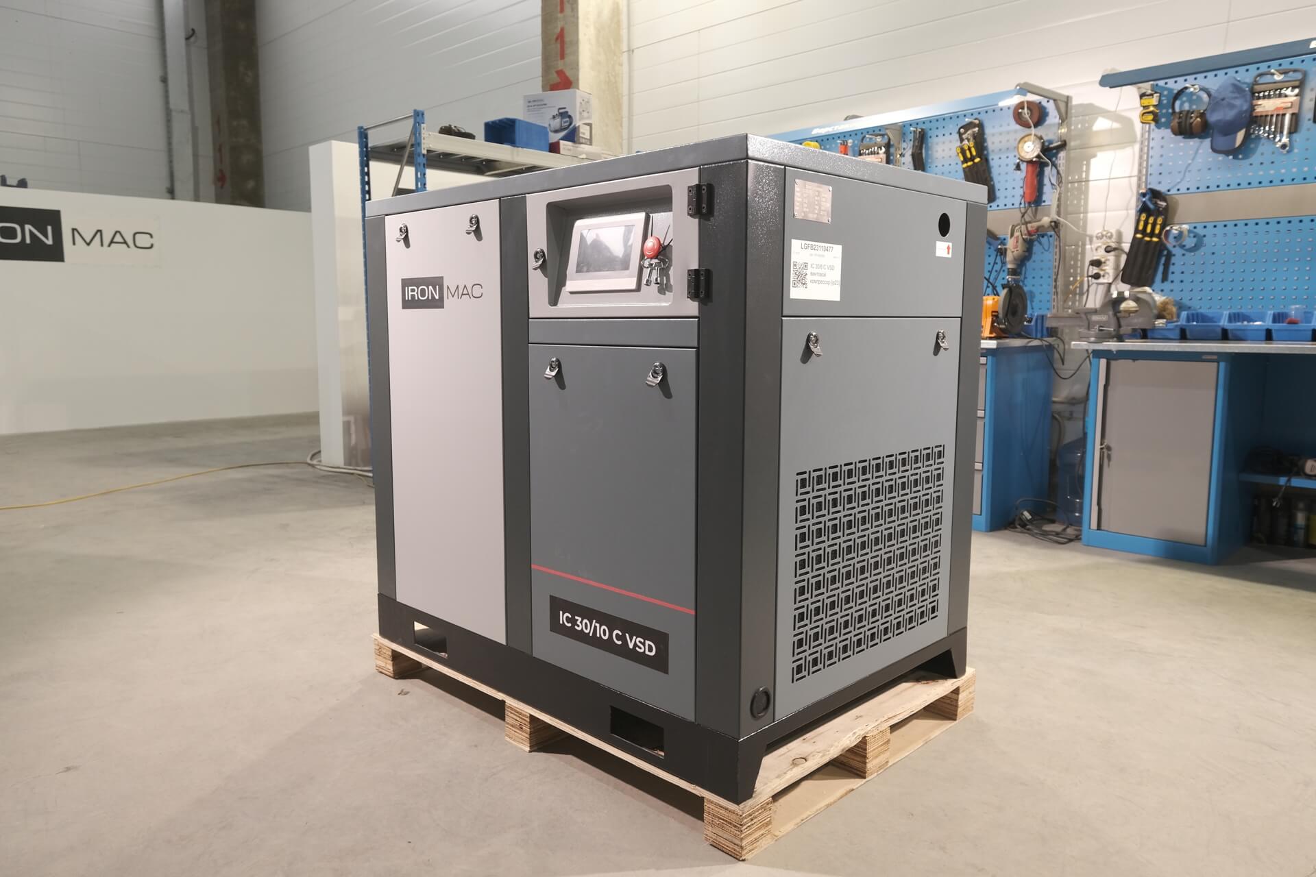 Винтовой компрессор IronMac IC C VSD IP 23 из профессиональной линейки, собран на прочной стальной раме. Компрессор предназначен для малых и средних предприятий, а все узлы конструкции фиксируются к жесткому основанию и дополнительно изолируются от вибраций. На серии C VSD реализована система прямого привода, а двигатель имеет уровень защиты по классу IP 23 с высокой степенью эффективности отведения тепла.