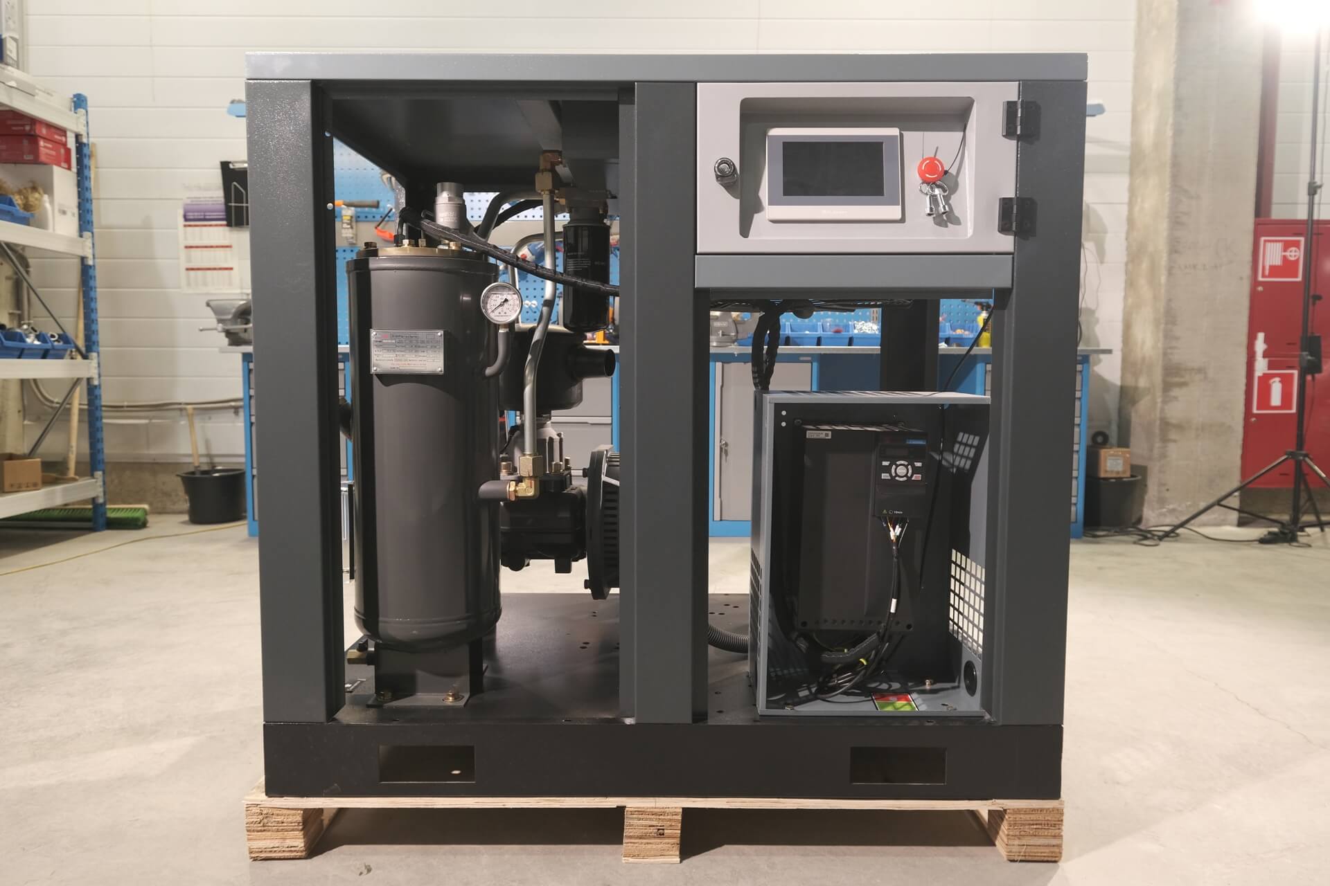 Частотный преобразователь Folinn обеспечивает плавный запуск и остановку компрессора, снижает пусковые токи двигателя и защищает устройство от перегрузок, короткого замыкания или потери фазы.