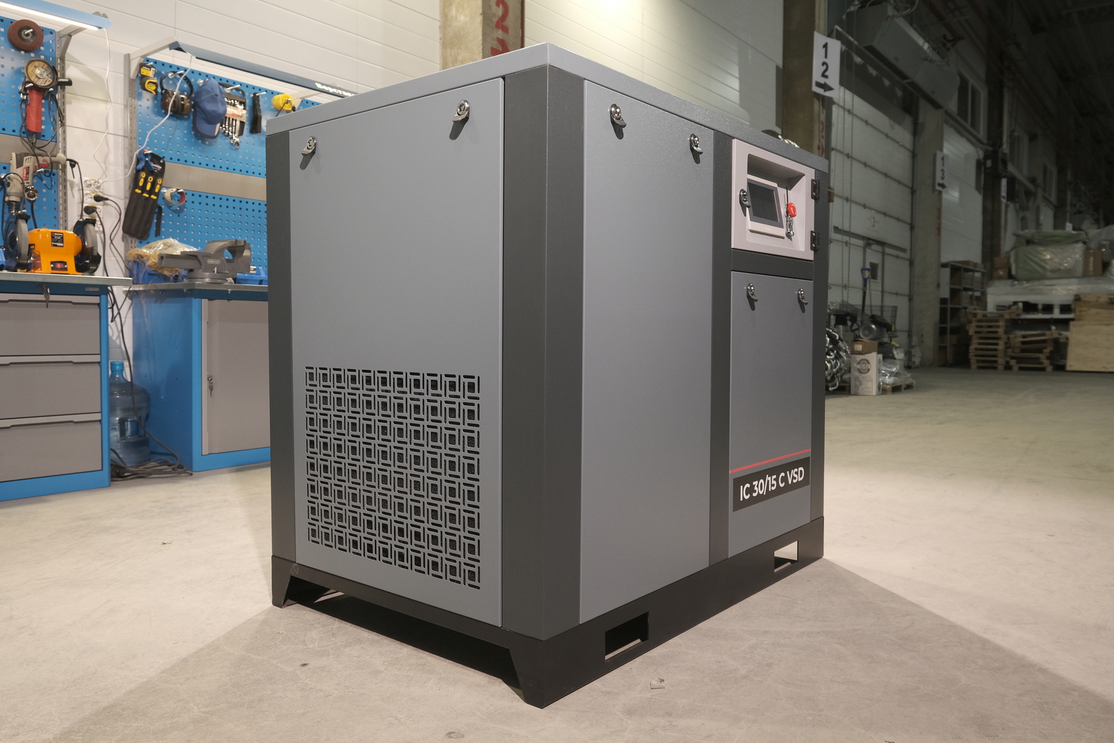 Винтовой компрессор IronMac IC C VSD IP 55 из профессиональной линейки, собран на прочной стальной раме. Компрессор предназначен для средних и крупных предприятий, а все узлы конструкции фиксируются к жесткому основанию и дополнительно изолируются от вибраций. На серии C VSD реализована система прямого привода, а двигатель имеет уровень защиты по классу IP 55.