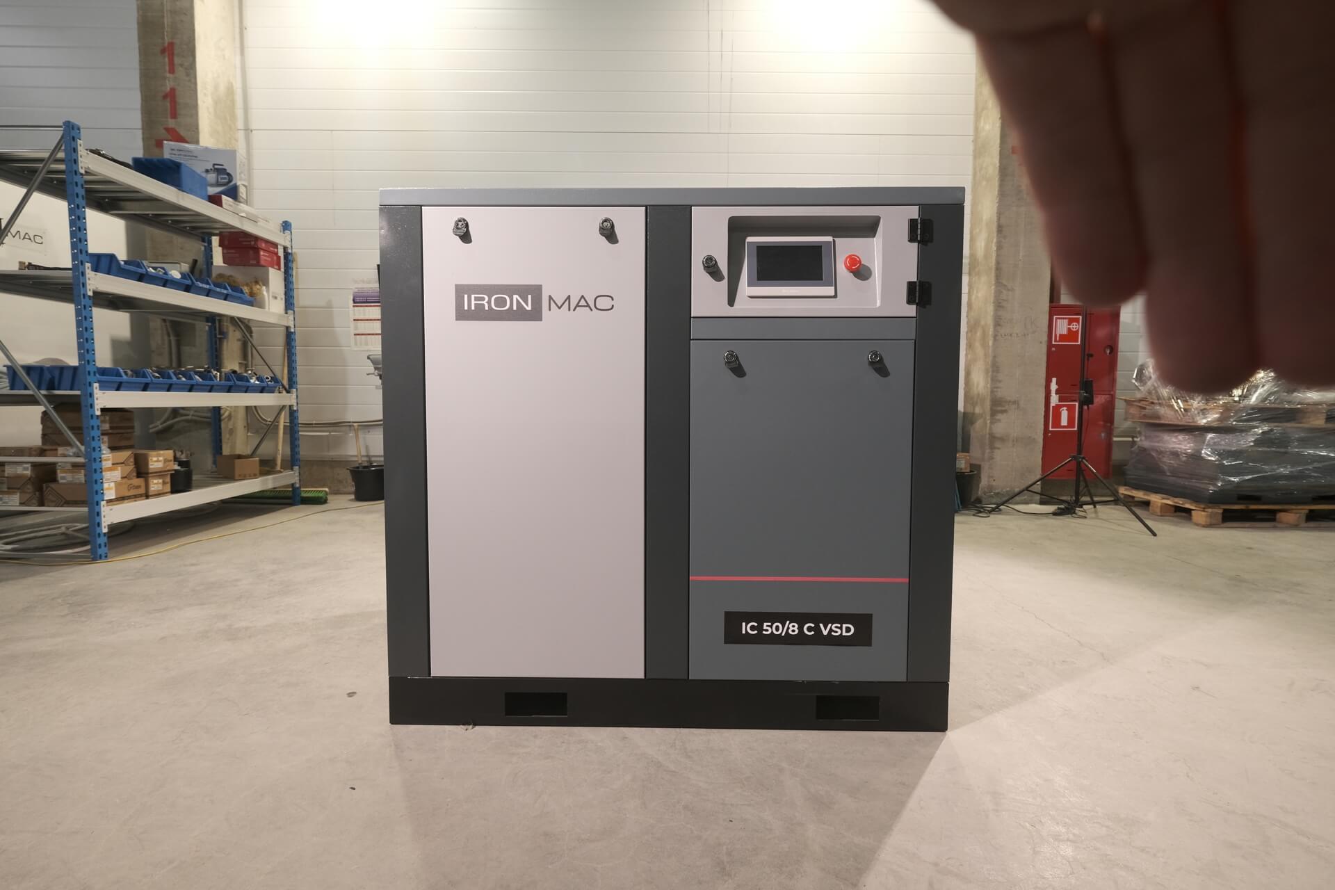 Винтовой компрессор IronMac IC C VSD IP 55 из профессиональной линейки, собран на прочной стальной раме. Компрессор предназначен для средних и крупных предприятий, а все узлы конструкции фиксируются к жесткому основанию и дополнительно изолируются от вибраций. На серии C VSD реализована система прямого привода, а двигатель имеет уровень защиты по классу IP 55.